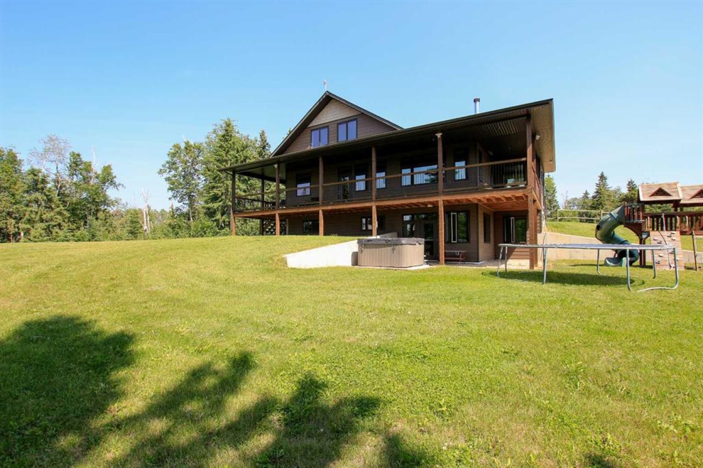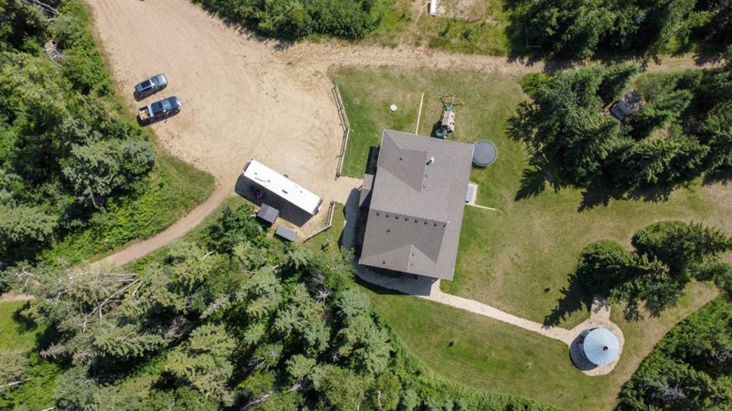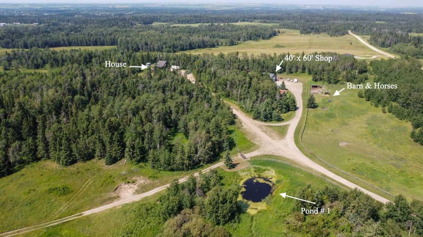 157.69 ACRES ~ FULLY DEVELOPED 2 STOREY WALKOUT ~ 5 BEDROOMS, 4 BATHS W/OVER 2000 SQ. FT. ABOVE GRADE~ 40' X 60' HEATED SHOP W/KITCHEN, BATHROOM, LAUNDRY & LOFT ~ SET UP FOR HORSES ~ 2 PONDS ~ Located just minutes east of Morningside and ideally positioned between Lacombe and Ponoka, this property offers the perfect blend of convenience and seclusion ~ Covered front veranda welcomes you to this well cared for home loaded with upgrades ~ The spacious foyer with 2-storey ceilings leads to the open concept main living space featuring hardwood flooring, high ceilings and an abundance of large windows that fill the space with natural light ~ The stunning kitchen offers an abundance of white cabinets, tons of quartz counter space including a large island with an eating bar, full tile backsplash, under cabinet lighting, window above the sink with a view, upgraded stainless steel appliances, and access to the wrap around deck and yard ~ Easily host large gathering s in the dining room that offers a second garden door with access to the wrap around deck ~ The living room is a generous size and is centred by a cozy fireplace that features a stone surround, raised hearth and a mantle ~ The primary bedroom can easily accommodate a king size bed plus multiple pieces of furniture, has dual closets with built in organizers and an ensuite with a walk in shower and oversized vanity with a built in desk ~ The home office has large windows that fill the space with natural light and is located next to the 2 piece bathroom ~ Laundry is located in it's own room just off the foyer, and offers built in cabinets ~ Open staircase overlooks the main floor and leads to the upper level where you will find 2 generous size bedrooms, a 4 piece bathroom and a playroom or storage space ~ The fully finished walkout basement with high ceilings, large above grade windows and operational in floor heat offers two additional bedrooms, a den/craft room, 4 piece bathroom, ample storage space and a large family room with a separate entry leading to a covered patio area with a hot tub ~ Just behind the house is a fire pit area and a playhouse ~ 40' x 60' shop is heated and fully finished inside with a full kitchen, 4 piece bathroom, laundry, and loft with another treed fire pit area ~ Fencing for horses with a barn and waterer ~ 2 ponds offer water supply for livestock ~ This beautiful property is surrounded by mature trees, rolling hills, scenic country views and is perfectly set up for a variety of uses; hobby farm, equestrian retreat or simply more space to live and grow! Seller receives annual surface lease of $3,000/year.